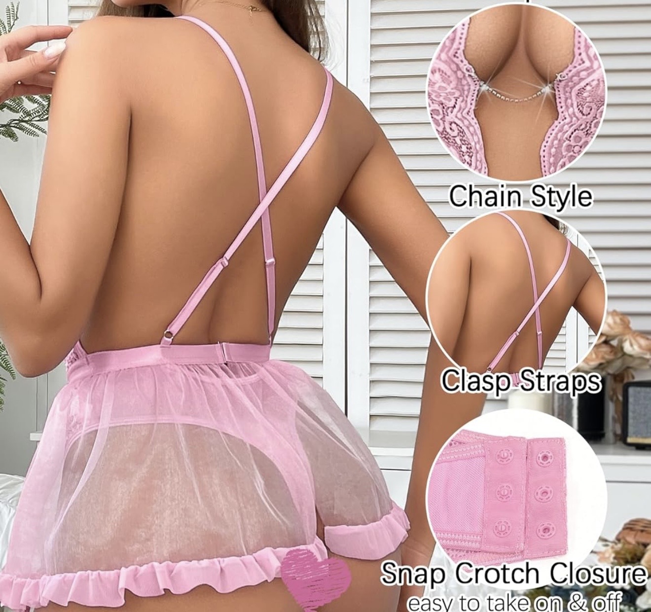 The Teddy is lace all the way through with snap crotch, cute sheer flirty skirt attached at the waist. It looks unique with a cutout in the stomach area. It has a little metal heart in the center. it would look good on any size or shape, all women.