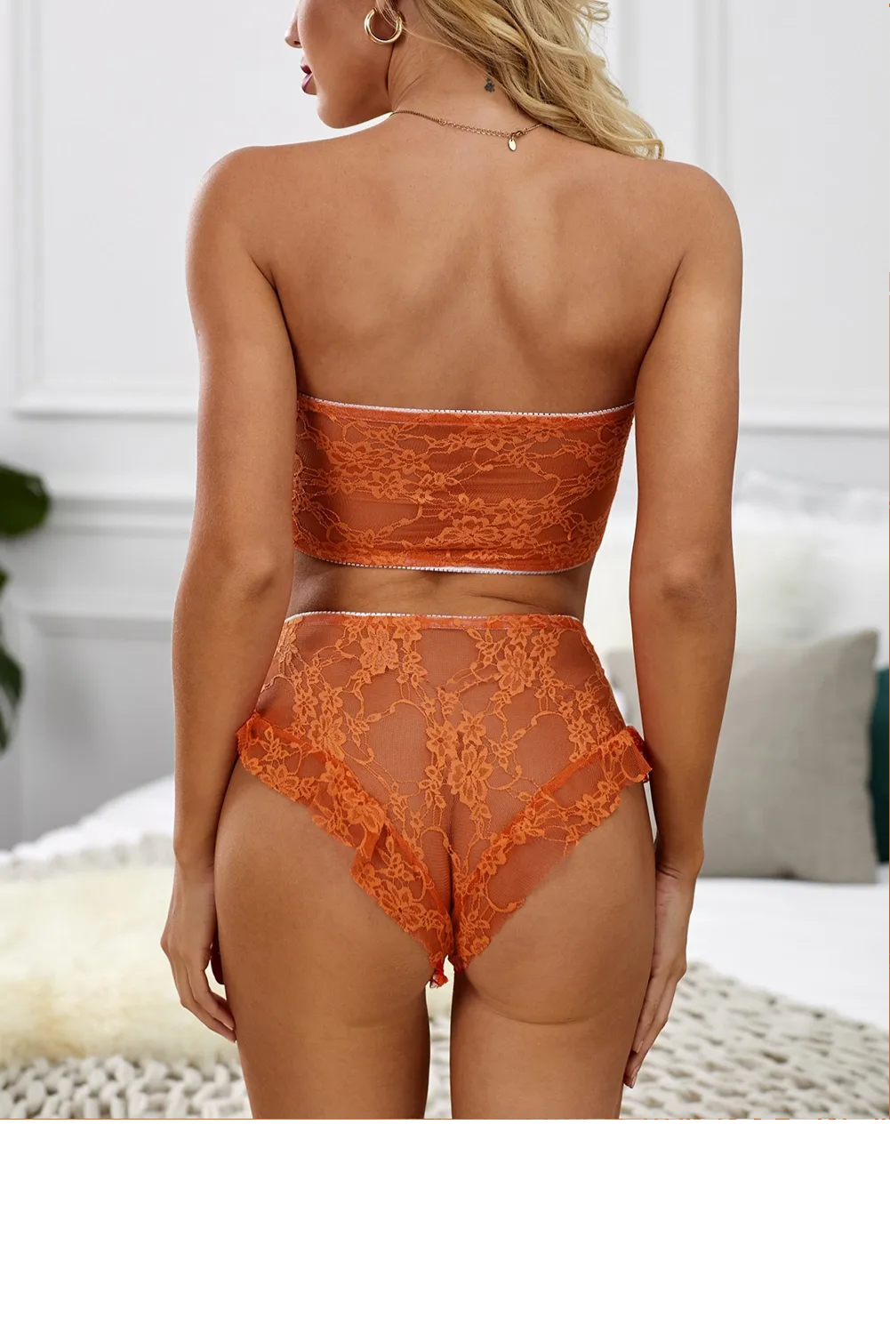 Introducing our exquisite Orange Lace Mesh Print Tube See Through Sleeveless Lingerie Set, designed to ignite passion and allure. This tantalizing ensemble combines delicate lace, sheer mesh, and a captivating tube design for a truly unforgettable intimate experience. Elevate your confidence and embrace your sensuality with this alluring lingerie set. Perfect for special occasions or to add a touch of seduction to your everyday life. Discover the power of self-expression and indulge in the ultimate intimate luxury.