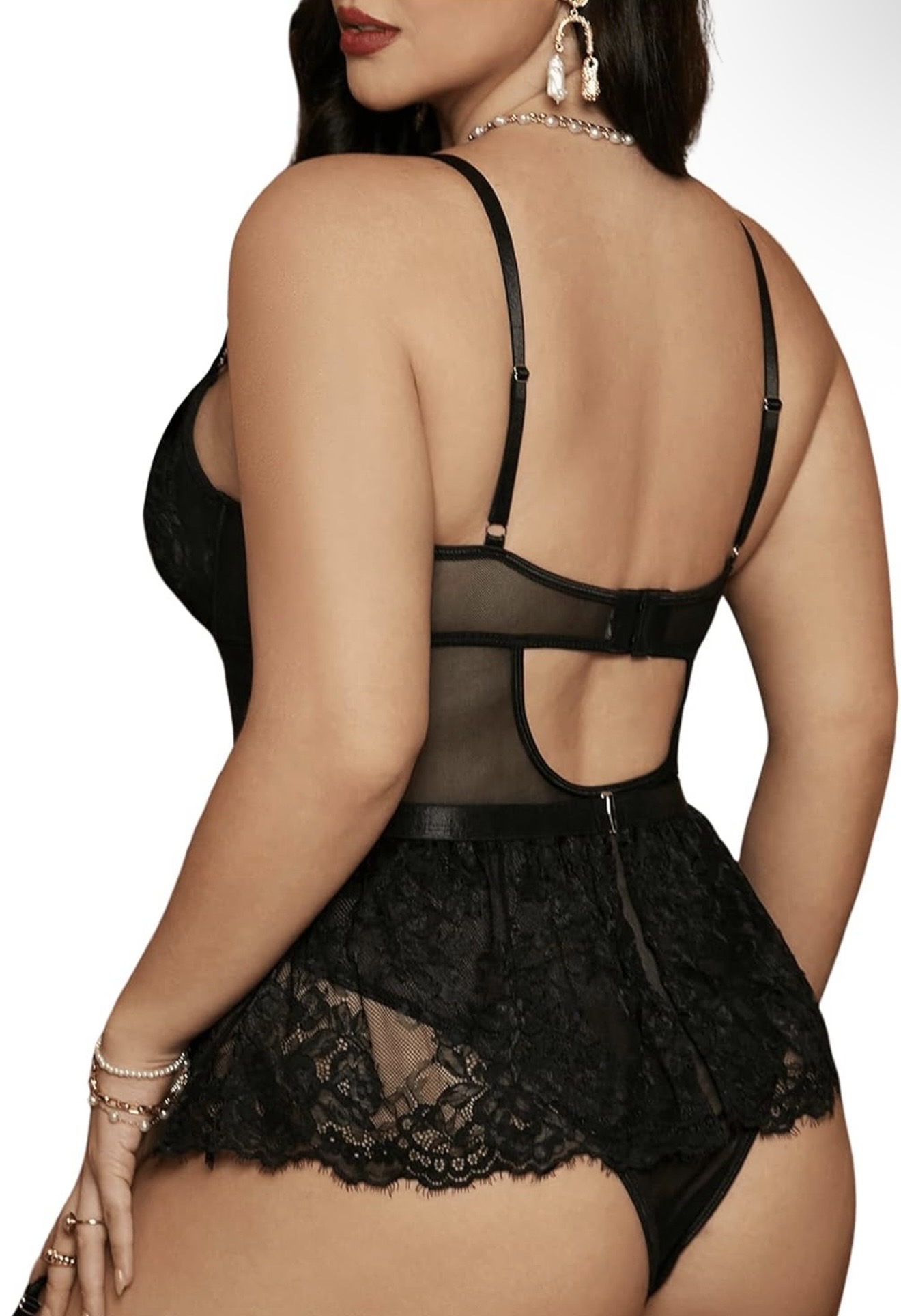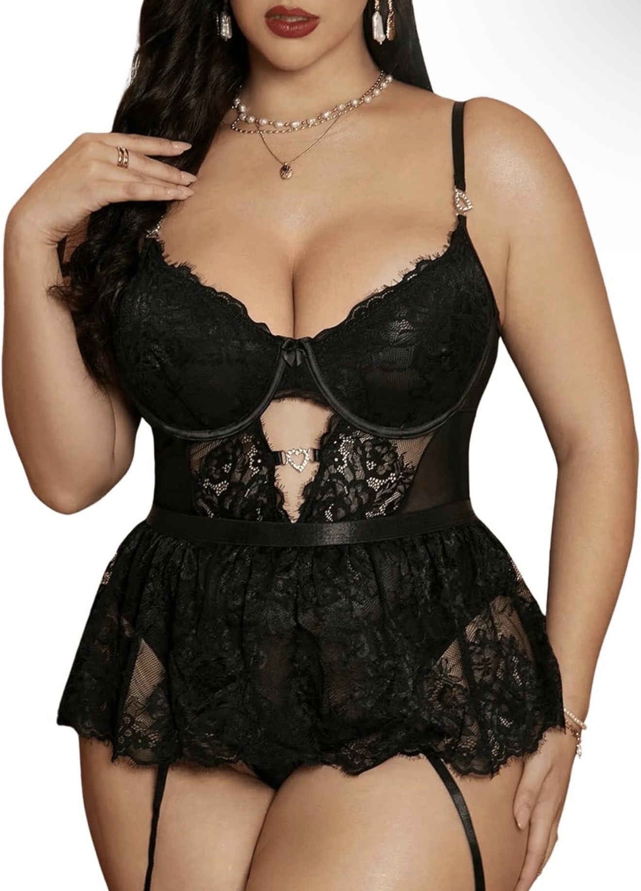Plus Size Lace Babydoll Spaghetti Strap V Neck Cut Out Teddy Lingerie Set with Garter Belts.