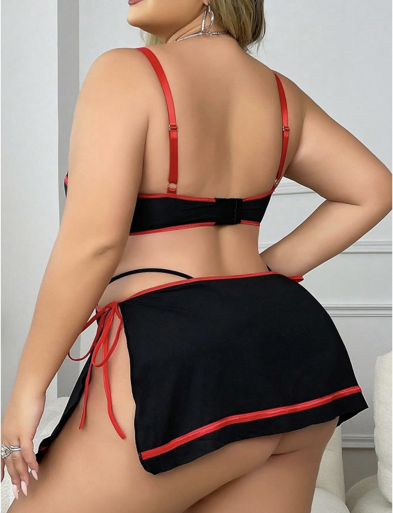 This 3-piece babydoll lingerie set includes a nurse roleplay costume with side tie details, lace trim, cutout nightdress, matching g string, and a headpiece for a seductive and playful look. Polyester, Elastane Hand Wash Only Imported